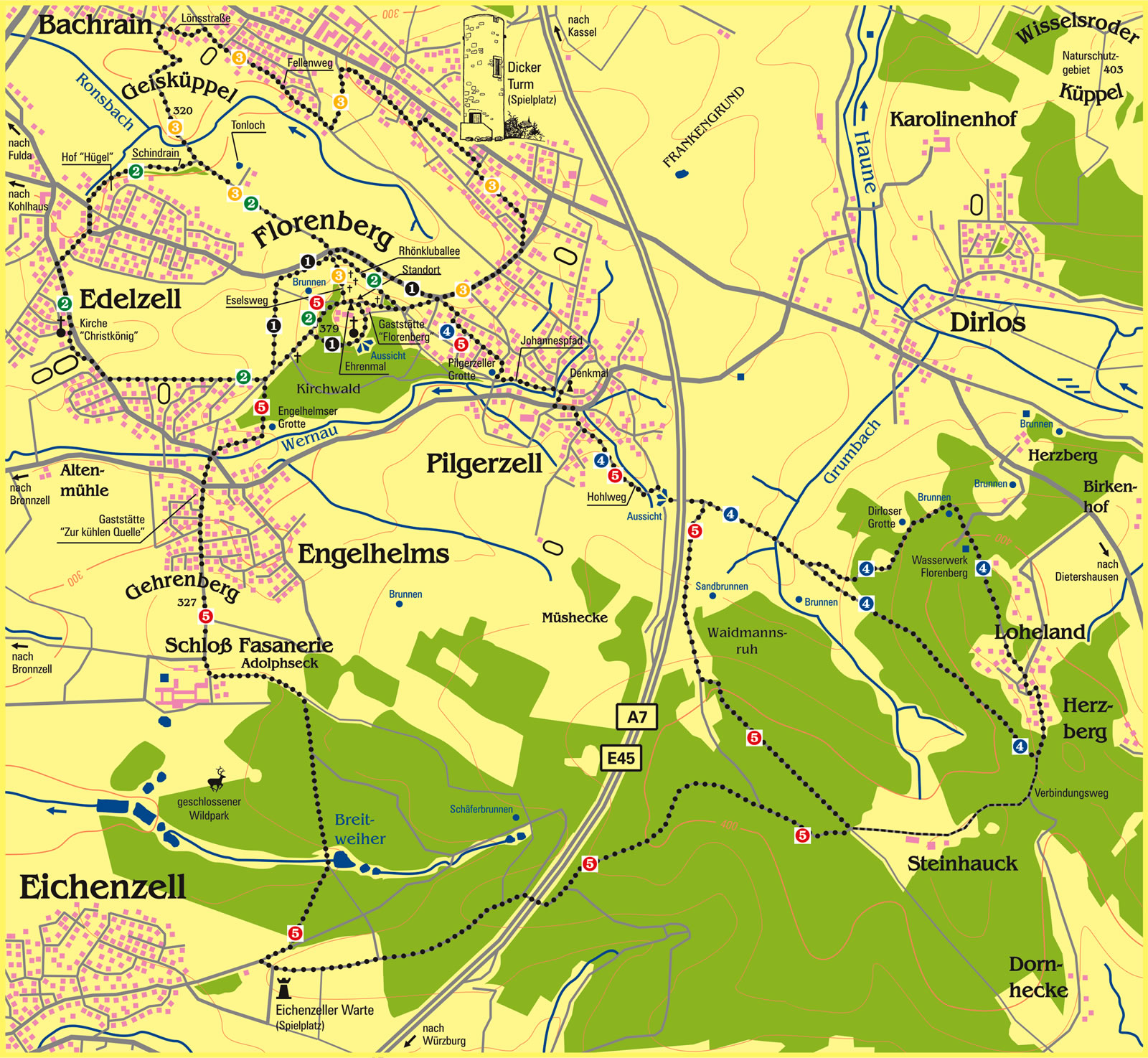 Die fünf Rundwanderwege beginnen und enden jeweils am Florenberg und haben eine Länge von 2 km bis 10 km.